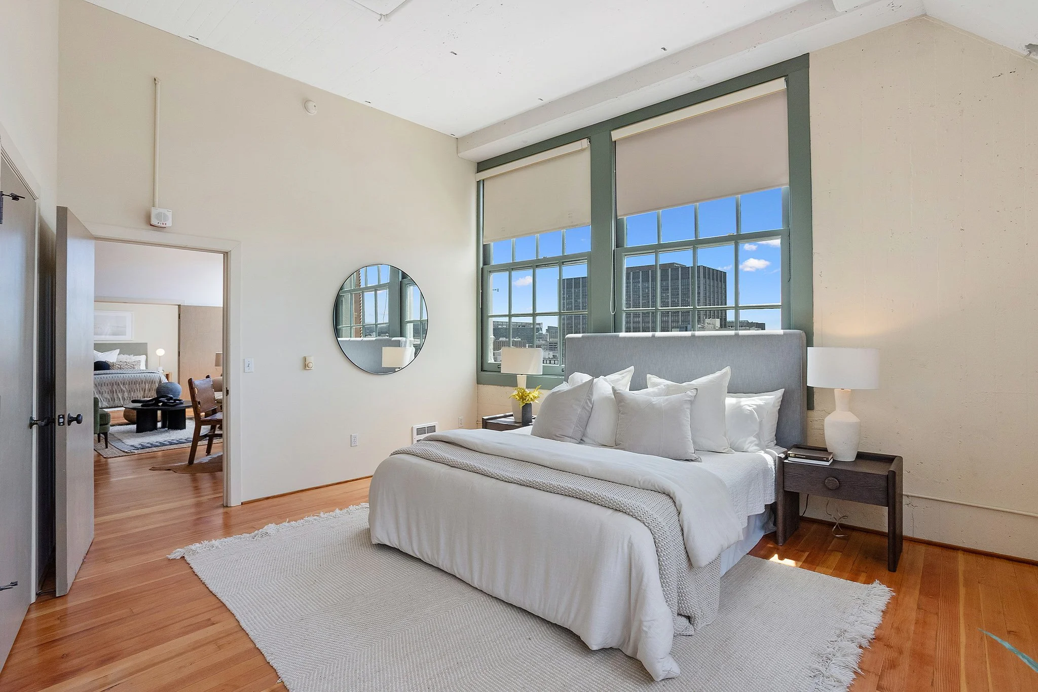 Bright bedroom with large windows, a bed with white bedding and multiple pillows, two nightstands with lamps, a round mirror on the wall, and a view of buildings outside. View fullsize